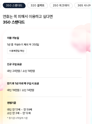 365 / 350 / 320 등 이용 가능한 날짜 별로 연간권을 구매하는 것입니다.