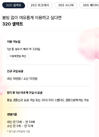 320 셀렉트 : 1년 중 성수기 제외한 약 320 사용 가능. 대인 19만원 소인 15만원