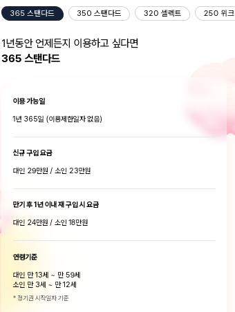 365 스탠다드 : 1년 365일 이용 가능. 대인 29만 소인 23만