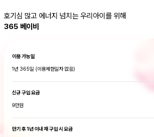 답변3 네 365 베이비가 있습니다. 연령 기준 24개월 ~ 35개월입니다. 신규 구입시 9만원 이며, 만기후 1년 이내 구입은 불가합니다. 다른 권종으로 가입해야합니다.